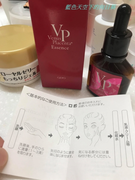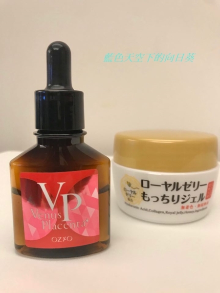 在使用OZIO維納斯女神胎盤原液後,我會再將自己已經使用了好幾罐的 OZIO蜂王乳凝露塗在臉部肌膚上加強保濕,讓乾性肌膚的我用來對抗老化效果更佳。