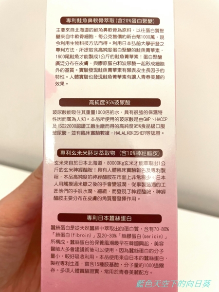 外盒側邊標榜含有:專利鮭魚萃取、高純度95%玻尿酸、專利玄米萃取、專利蠶絲蛋白,
