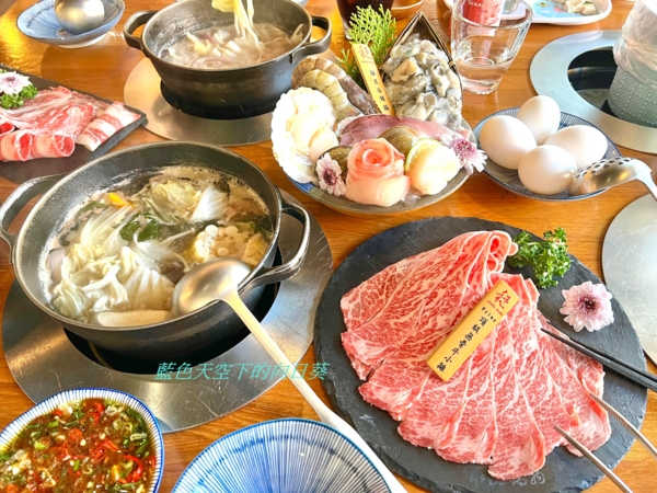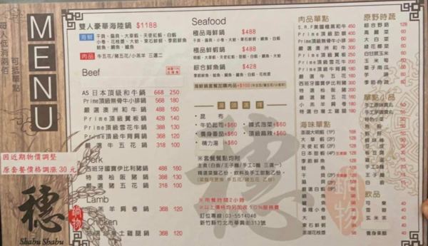 菜單裡有日本和牛、美國牛、西班牙伊比利豬、小羔羊、台灣土雞腿、海鮮等。
