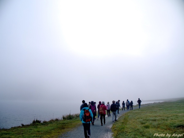 清晨漫步於霧濛濛的湖邊,