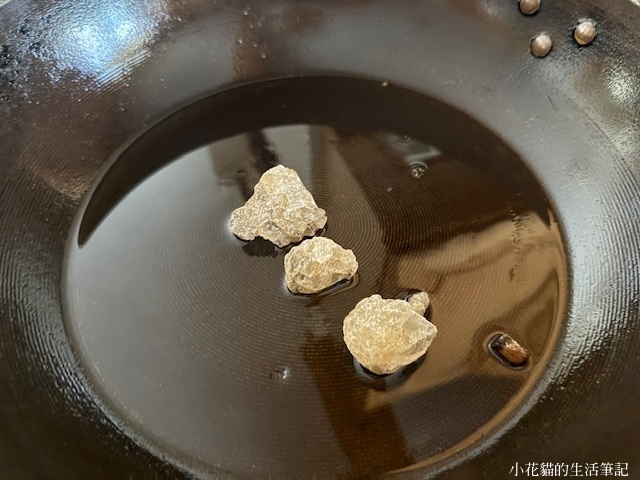 放冰糖入油鍋(熱鍋冷油) 先大火五分鐘後轉小火炒出糖色,一直大火炒糖會變苦