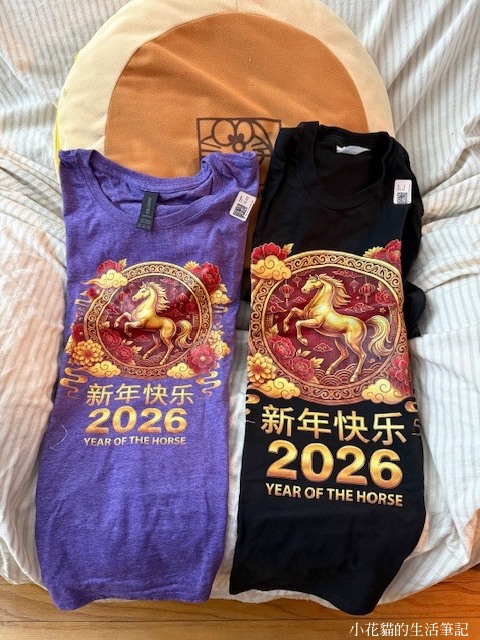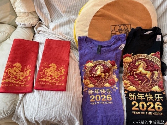(上)公婆送的非常好吃的馬年限定版黑巧克力 (下)鄰居老太太送的馬年男女恤衫和桌布