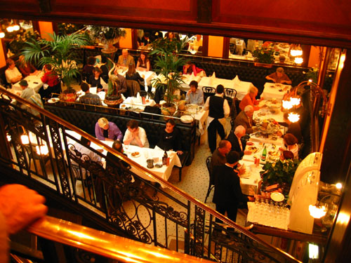 這次寫的是一家法國的最老的酒館 Bofinger (上圖右, 旅遊指南的簡介, 及最上圖, 餐廳一隅), 位於巴士底區 (Bastille), 離地鐵站不遠, 和巴士底歌劇院也只有幾步路之遙, 很想說我們是為了聽歌劇才「順道」去Bofinger 的, 可惜不是。(在波士頓修來的一點文藝氣息, 一到巴黎這個花花世界, 就全拋之腦後了。) 其實那天,我和太座各有心機, 美其名是要造訪【雨果】的故居, 追思懷念一下這位法國近代的大文豪, 結果出現下面的對話: