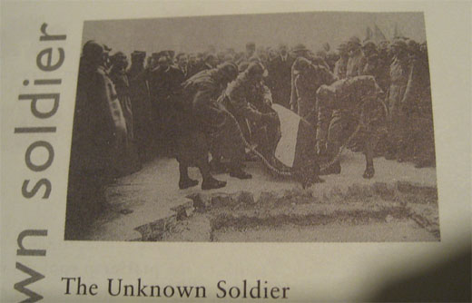 「...在一次世界大戰結束前,就有人提議要為所有為國捐躯的烈士舉行紀念活動,因為這場殘酷的戰爭吞噬了國家好幾代的青年,1918年,法國上下兩院一致決定,將一名無名戰士的遺骸安葬在萬神殿裏,然而,一戰退伍軍人協會卻不同意選擇萬神殿這樣的地方,提議將無名戰士葬在凱旋門下,1920年11月11號,無名戰士的遺骸由一輛戰車莊嚴的送至凱旋門停柩,同一天,開創法國第三共和 Leon Gambetta 的心臟由同一輛戰車護送至萬神殿安息,同一儀式使抵抗普魯士的共和國領袖與一次大戰的英勇戰士走在了一起...」