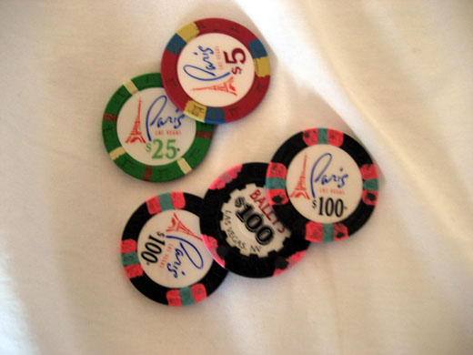 , 於是使出渾身解數來爭奇鬥艷, 標新立異, 目的就是為了吸引你前來一遊, 讓你口袋中的 20 美金乖乖的掏出來, 想想, 若是拉斯維加斯一年遊客有三千八百萬人 (2005年資料), 人人都貢獻 20 美金, 這獲利可是驚人, 注意喔, 這 20 美金可幾乎是淨利, 若是快得話, 只消五分鐘的時間, 賭場毫不費力就讓你的 20 美金 "打水飄" 了。所以你要是聽到這樣的對話: