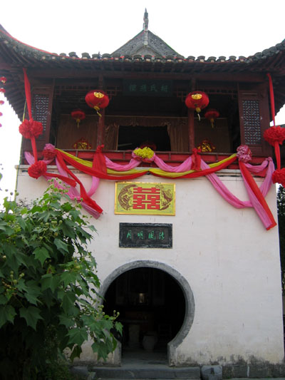 我站在西遞的 "胡氏綉樓" 前, 看著 「富家小姐」 出現在滴水簷下 , 一隻水袖猶抱琵琶似的遮住半邊臉, 只露出一彎秋水尋尋覓覓樓下的如意郎君 (或是尋找獵物?), 纖細的手指將繡球慢慢地舉起, 樓下的男兒熱血開始沸騰, 摩拳擦掌之間, 個個似乎都有誓在必得的決心。