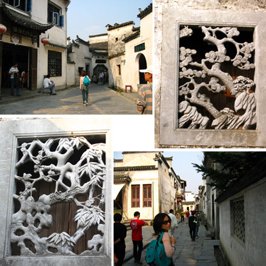 圖二, 西遞村內之街景, 另有 "松竹梅" 窗櫺石雕, 據導遊說, 曾有東瀛客為此出價十萬美金。