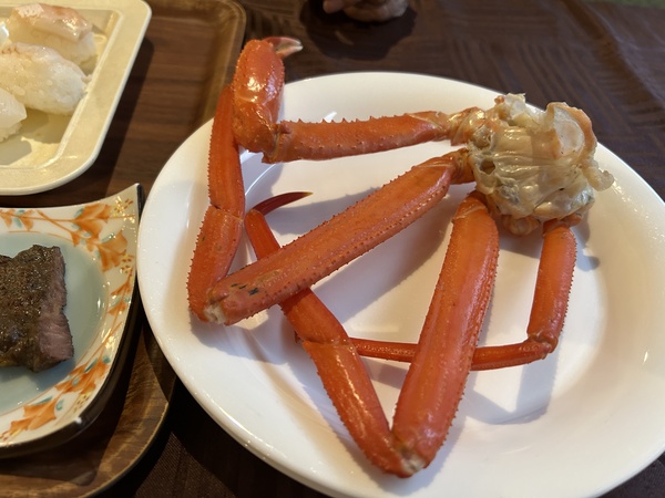 晚餐6:30,自助餐式,今天的特色就是長腳蟹吃到飽,蟹腳的肉還不錯,我們各吃了兩個半隻,其他就差不多。