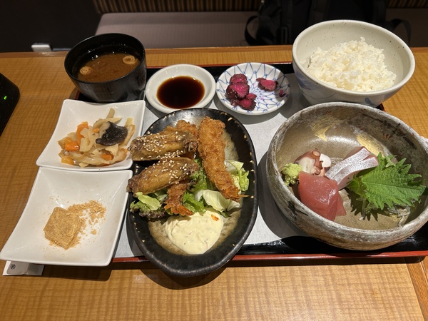 午餐 到站前地下街エスカ(ESKA)。還不到12點,各餐廳到處排隊。找了風來坊吃雞翅套餐,手羽(雞翅)*4+紅燒牛腩1080yen 、刺し(生魚片)+手羽(雞翅)*2+炸蝦*2 1280yen,比在台北的價格,超便宜的。