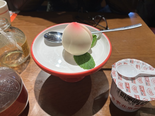 再加飲料酸梅湯及梨湯(各10)。這裏免費加麵,加醬,還有臘八蒜隨意吃,呈藍色味道與糖蒜類似。最後又加一個像桃子的杏仁豆腐和酸奶冰淇淋做為餐後甜點。杏仁豆腐原價15人民幣,因爲大眾點評的促銷,今日只要6.5元,非常划算。