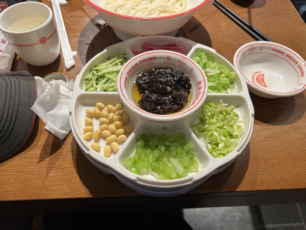 雍和宮也是大景點,時間已晚,今天只到旁邊的方磚廠吃炸醬麵。掃碼點餐,就點了菜單上最顯眼的特製炸醬麵38人民幣,一碗麵配13種配菜,配菜有雙層,共13種。