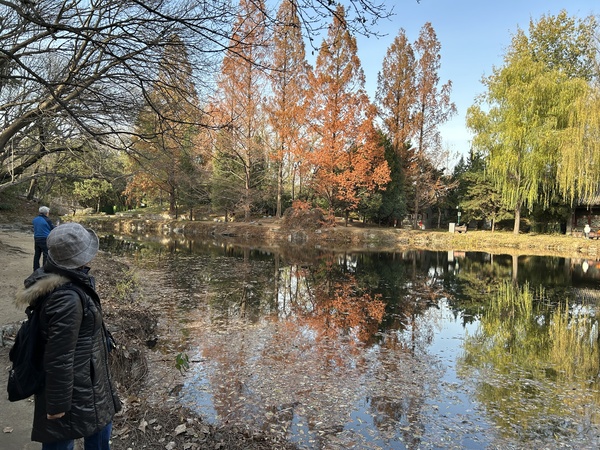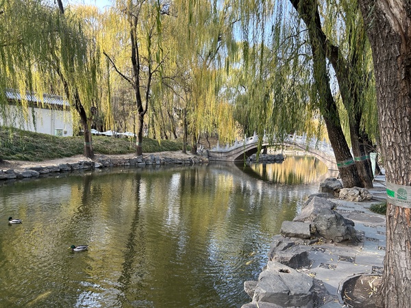 從諧趣園沿後湖的河流往北宮門走,可惜紅葉已枯萎,只剩下幾株落羽松在水中形成美麗的倒影。