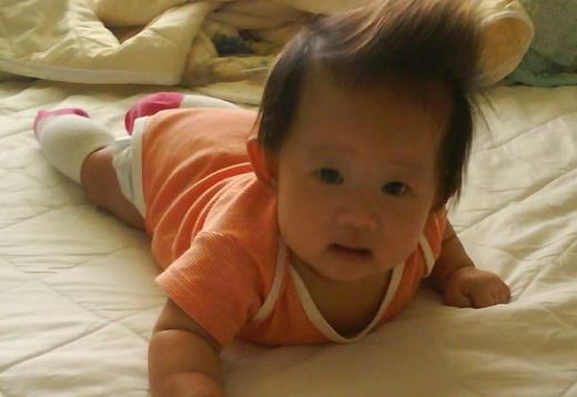 這樣的小七,像訂了鬧鐘般的準時,不多不少,滿四個月的那天,在我吃驚的雙眼下--翻身了。兩個星期後,翻身的技巧更上層樓,學會連續翻,還因此滾到床下,嚇傻了在場的人。我心臟都快跳出胸口了,還好,一切無礙! 呼!