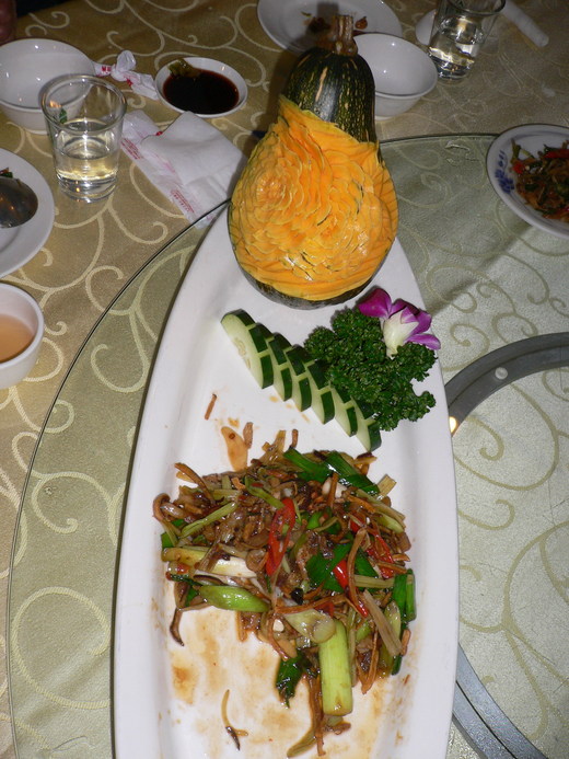 了,盤子滿大的又裝飾的很美,有雕刻 牡丹花之南瓜、鴛鴦一 對、 喜鵲 雙雙對對