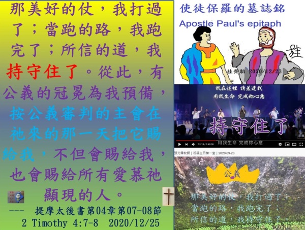 12月25日禱讀經文Pray-Reading Verse(s):提摩太後書第04章第07-08節:[那美好的仗,我打過了;當跑的路,我跑完了;所信的道,我持守住了。從此,有公義的冠冕為我預備,按公義審判的主會在祂來的那一天把它賜給我,不但會賜給我,也會賜給所有愛慕祂顯現的人。I have made a good fight, I have come to the end of my journey, I have kept the faith: From now on, the crown of righteousness is made ready for me, which the Lord, the upright judge, Will give to me at that day: and not only to me, but to all those who have had love for his revelation. 2 Timothy 4:7-8]