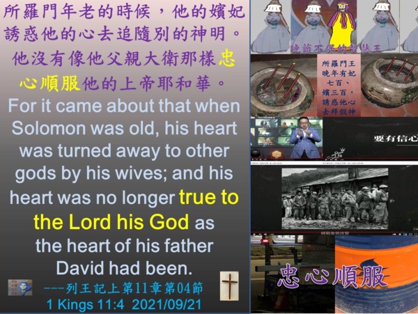 09月21日精選禱讀經文Pray-Reading Verse(s):列王記上第11章第04節:[所羅門年老的時候,他的嬪妃誘惑他的心去追隨別的神明。他沒有像他父親大衛那樣忠心順服他的上帝耶和華。For it came about that when Solomon was old, his heart was turned away to other gods by his wives; and his heart was no longer true to the Lord his God as the heart of his father David had been. 1 Kings 11:4]