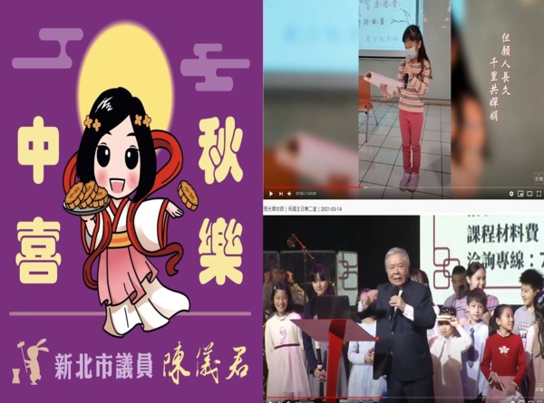 歌曲部分,我挑選鄧麗君的國語老歌[但願人長久],歌詞就是蘇東坡的水調歌頭,台語歌我挑選陳雷的[慶團圓]、廣東歌把許冠傑的[把酒當歌],改成[對月當歌]。英文歌曲我挑選[Moon River]是電影主題曲。