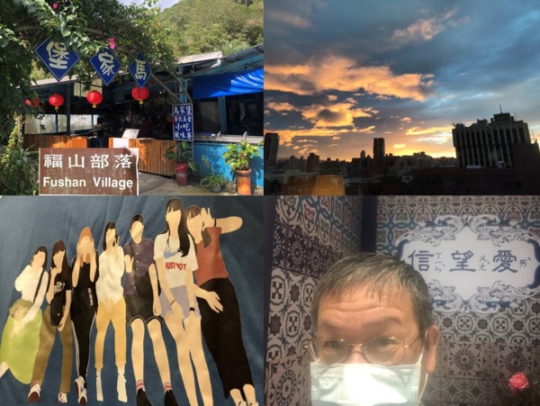 第二張:淘氣接續中斷的導覽課程用餐地點、妻子受訓做功課拍的風景、女兒的衣服上的眾少女畫像、我在美河堂的自拍