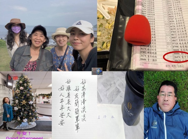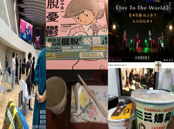 第五張:左邊是彭大姊到教會禱告會的自拍、中上的妻子近期看的漫畫書、右上是聖誕前的聖歌、右下是我第一次吃外送的火鍋、電視畫面的電影是[去年聖誕節],港星楊紫瓊也參與演出。中下是妻子近晚連我買的晚餐當夜都吃不下,讓我有點擔心,必須持續為她的未來禱告。阿們!