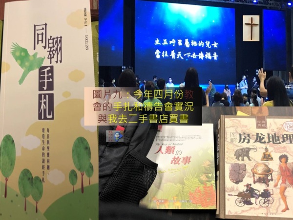 圖片九:左邊是教會四月份的手扎、右上是四月禱告會實體聚會拍照和我遺失了兩本房龍寫的歷史地理書,到公館二手書店重新買新的版本