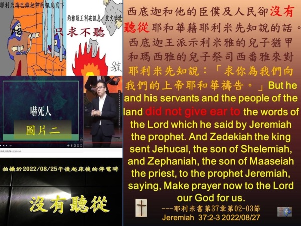 08月27日精選禱讀經文Pray-Reading Verse(s):耶利米書第37章第02-03節:[西底迦和他的臣僕及人民卻沒有聽從耶和華藉耶利米先知說的話。西底迦王派示利米雅的兒子猶甲和瑪西雅的兒子祭司西番雅來對耶利米先知說:「求你為我們向我們的上帝耶和華禱告。」But he and his servants and the people of the land did not give ear to the words of the Lord which he said by Jeremiah the prophet. And Zedekiah the king sent Jehucal, the son of Shelemiah, and Zephaniah, the son of Maaseiah the priest, to the prophet Jeremiah, saying, Make prayer now to the Lord our God for us. Jeremiah 37:2-3]