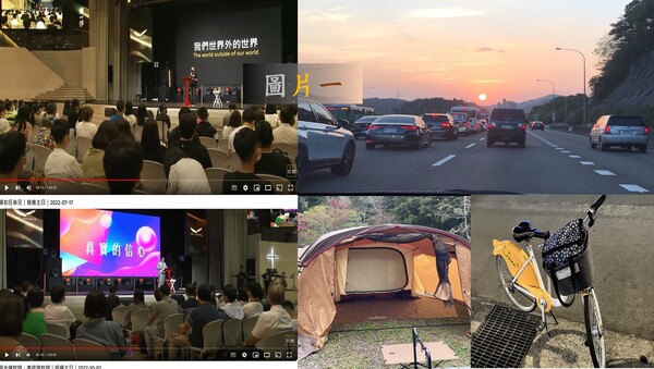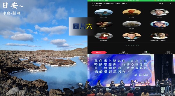 圖片六:左邊是故鄉木白小妹旅遊照、右上是小組連線貼圖、右下是我與妻子禱告會的自拍