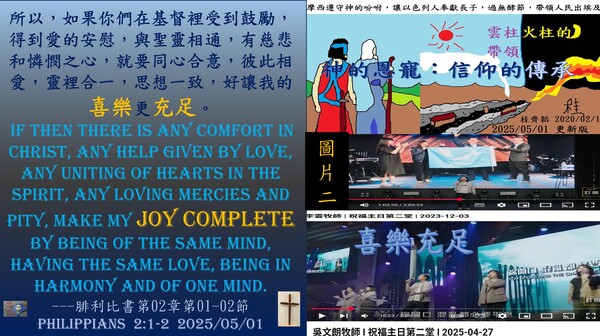 05月01日精選禱讀經文Pray-Reading Verse(s):腓利比書第02章第01-02節:[所以,如果你們在基督裡受到鼓勵,得到愛的安慰,與聖靈相通,有慈悲和憐憫之心,就要同心合意,彼此相愛,靈裡合一,思想一致,好讓我的喜樂更充足。 If then there is any comfort in Christ, any help given by love, any uniting of hearts in the Spirit, any loving mercies and pity, Make my joy complete by being of the same mind, having the same love, being in harmony and of one mind. Philippians 2:1-2]。