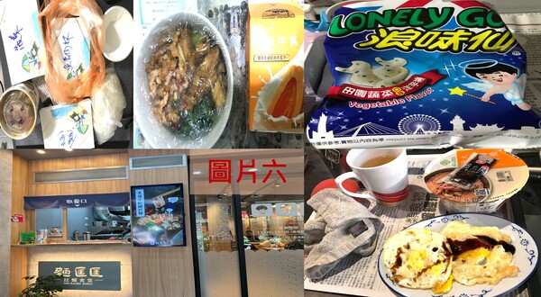 圖片六:本期家庭生活拼圖:四月份我買的全家餐點、妻子拍的店家、女兒請我吃的零食及我外出唱歌用餐的自拍
