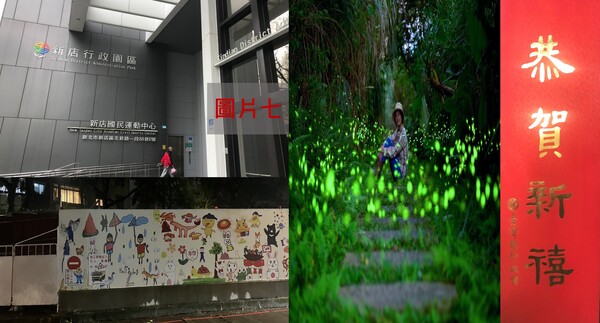 圖片七:本期精選街頭拍攝照片拼圖:左上是我繼續游泳的活動中心、左下是街頭的壁畫、右上轉貼至LINE的公益旅遊貼圖、右下是妻女服務公司的春聯