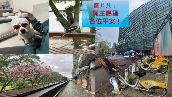 圖片八:問安圖:妻子拍攝家狗與外面的鳥、我拍櫻花,近期去和平籃球場重新騎單車的照片拼圖