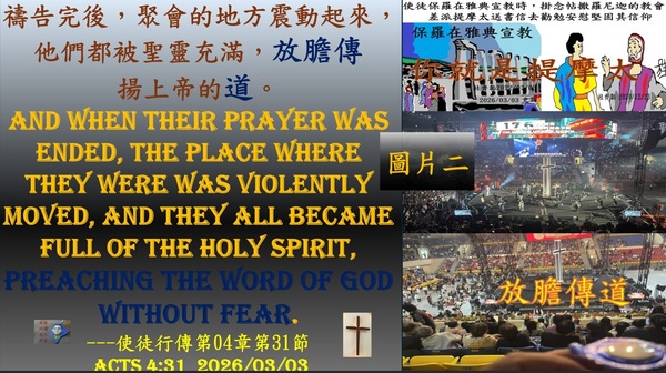 03月03日精選禱讀經文Pray-Reading Verse(s):使徒行傳第04章第31節:[禱告完後,聚會的地方震動起來,他們都被聖靈充滿,放膽傳揚上帝的道。And when their prayer was ended, the place where they were was violently moved, and they all became full of the Holy Spirit, preaching the word of God without fear. Acts 4:31]