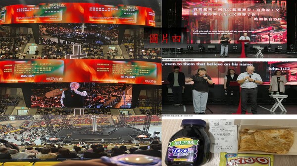 圖片四:今年3月1日和平藍球館烈火特會與前年2024年09月01日主日第二堂康麥克牧師的兩堂主日訊息拼圖,含兩堂的聖餐