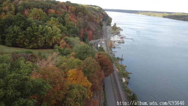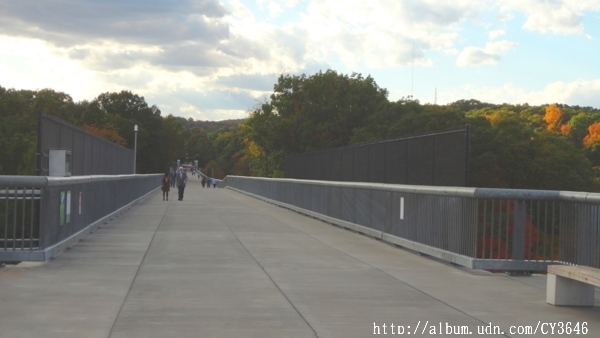 要從哈德遜河的東岸走上步行橋,若從 Washington Street 的入口,有個樓梯走上去就是了;若從Upper Landing Park 的入口 ,則可乘坐有21層樓高的河濱電梯(2014年8月14日才開放)。 居高臨下看紅葉的景觀感覺很不一樣。紅黃綠色交錯,鎮上一些具有歷史的建築都盡收眼底,山彩水秀真是美。這座橋的橋面鋪得非常平整,除了各地來的遊客在此遊憩、賞景之外,也有居民在上面跑步、散步、遛狗,甚至輪椅也通行無礙。