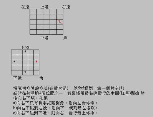 魔術方陣的填法(奇數次方): 以5x5為例,第一個數字(1) 必放在有星號4個位置之一,我習慣用最右邊縱行的中間(紅星)開始,然後向右下填,如果