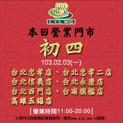 【春節營業門市】初四營業門市:台北店、台南店、高雄店 │ 全省門市詳細營業時間請至官網查詢 │ C.Y.S.假髮接髮