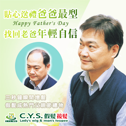 趁著父親節,帶爸爸到【C.Y.S.假髮接髮】專業假髮專賣店親自試戴,讓爸爸重回年輕自信!【C.Y.S.假髮接髮】在父親節老爸們準備了更多帥氣髮型,孝順老爸不能等,父親節相關活動請洽全省16間門市,或撥打免付費服務專線0800-450-450!