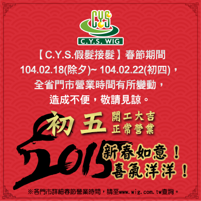上一則: 【春節營業門市】初一營業門市:台南旗艦店、高雄五福店 │ 全省門市詳細營業時間請至官網查詢 │ C.Y.S.假髮接髮下一則: 【誠徵│髮型設計師】保障36000起 ☞ C.Y.S.設計團隊招募中 ☞ 快來跟我們一起創造美麗! │ C.Y.S.假髮接髮