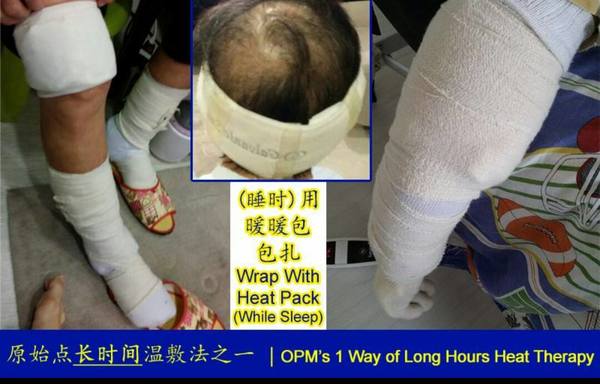 既然中西醫無法解決她的痛苦,她就開始接受我的建議,全面並努力配合用原始點處理。除了每天一次的全身按推,戒口全部的寒涼食物和中西藥,喝用乾薑熬煮的姜湯,還有24小時的溫敷。白天坐在溫敷毯上,晚上睡一整晚的電熱毯。在開始處理的時候,有碰到一些困難,就是她的皮膚一塗上姜泥、姜膏或薑粉就發的更嚴重, (這時才發現, 適合別人的方法不一定適合自己, 一定要根據患者的年齡和狀況做調整, 或先一小部分的試用)。還有就是她無法喝濃姜湯,無法喝到重症病人需要喝的薑量,她只能喝25g的乾薑熬煮的姜湯,後來聽從別人的意見就每天多吞服15粒的 薑丸,可能是當時的按推手法還不夠精准, 不能將體傷揉開,結果整個口腔內和嘴唇都長滿了紅疹。這種情況嚴重影響了她的食欲,整個人變得很消瘦。後來我們除了試把薑量減到15g,再將包上一層廚房紙的暖暖包用紗布包紮在濕疹比較嚴重的地方,做長時間的溫敷,幾天後腳部流膿水的部位開始變幹了,嘴巴裡的紅疹也慢慢的減少,這時我們知道處理的方向對了。。不久患者的皮膚慢慢有了起色,食欲也開始變好了。。。