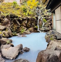 餐後回到旅館,開始當晚的泡湯。此地的湯泉種類甚多,有白湯(白濁硫磺泉)、黑湯(鐵質)、青湯(硫酸鹽泉)、黃湯(硫磺泉)…等等。每家溫泉旅館都會標示他們的「湯」是甚麼「湯」?然而對我來說,只要熱呼呼地、浸泡其中、覺得舒暢無比的,就是好湯。