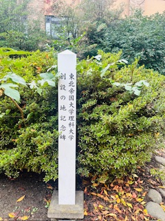 說來也真巧合,就在橫過馬路後,立刻看到一支白色的紀念碑,上面寫著「東北帝國大學理科大學創設之地紀念碑」。