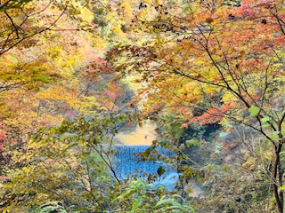 美麗的山景總離不開潺潺的流水。我們邊聽水聲,邊繞著石階盤旋而下,總算在中途看到了瀑布。一時,但見頃瀉而下的瀑布如一道藍色的水簾,隱身在繽紛燦爛的樹林裡,景致美極。我拿起手機,一再拍照,真希望永遠留住眼前的美景。