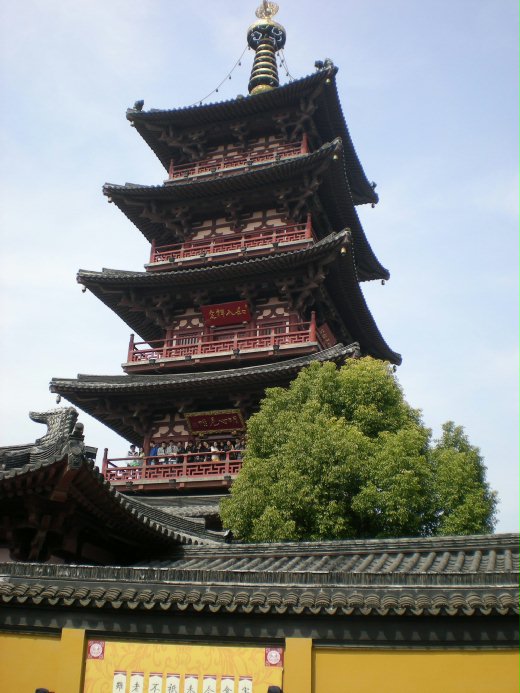 就是這一首充滿意境,張繼所寫的詩,我們對此古剎充滿期望,然而,一到古寺外,我們整個心情都沒了,這個應是充滿詩情畫意的清幽之地,已成了半商業的店,到處是"要不要導遊的叫賣聲",也罷,不看地上,看空中吧,空中的景色還不錯,至少還保存古貌,來到鐘樓,一聲聲的鐘聲傳出,蠻急促的,原來是遊客敲的,你只要付5元人民幣,就可以敲鐘,不錯,付了錢,我們一行人就上了樓,我們才敲了一下,一群大陸遊客也上來了,沒想到,這群人就把我們的敲鐘木搶去,真是野蠻,我們說我們先到的,可是,他們還是很凶悍的不給,最後,我們還是脫掉禮儀的外表,展現出人性生存的一面,重奪敲鐘棒o