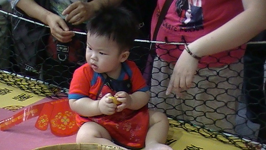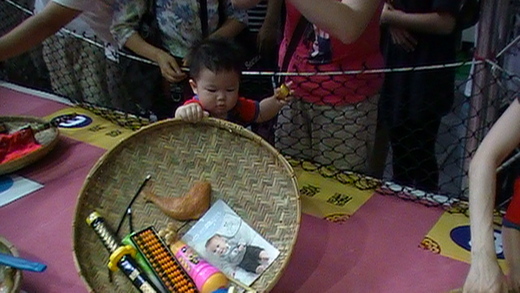 抓週開始他也是只看不動,正在傷腦筋時他突然一把抓住 金元寶,幼梨啊,這就對啦,馬麻以後都靠你啦!把玩金元寶一陣子後,他又突然一把抓住米篩,要將它整個翻過去,我在一旁搖旗吶喊,耶~~~冰豆冰豆(翻桌)!他也真的將它翻了。旁邊的爸爸媽媽都露出驚異的眼神看著我們,還很想把他們寶寶的眼睛遮住,內心的旁白大概是有其母必有其子吧!