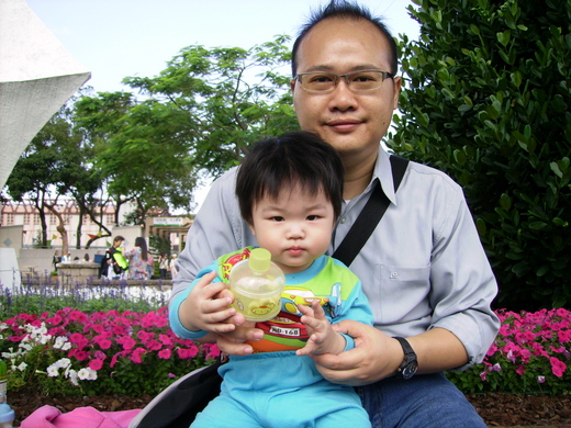 沒關係,去逛不用預約券的館好了,不好意思哦!到處都排了長長的人龍。好啦!戶外也很美,我們就在園區內走走好了。到處都種了花,幼梨啊,快看有花耶!他大哥可不管你什麼花不花的,他只對地上的木頭和小石子感興趣,只是一直在轉圈圈和撿石頭,還對其他的遊客的腿感興趣,一直要去抱他們的腿,搞得經過幼梨啊的遊客,紛紛在閃避他,甚至還有高中女生被他嚇得尖叫連連。所以我們一家三口就一直在上演著,幼梨啊跑,我追,老公拼命錄影存證的畫面,至於花呢,我和老公都沒機會看到幾朵。