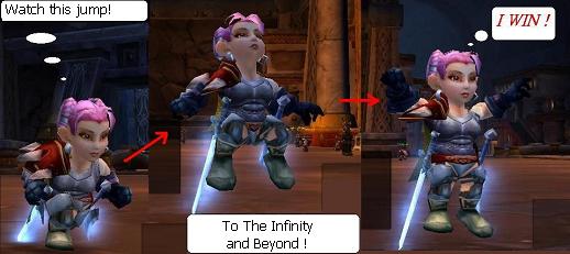 在Clat的細心調教以及一干好友相罩的情況下,矮瓜戰士東征西討,順利的一路過關斬將:從 Deadmine → The Stockade → Gnomeregan → Scarlet Manastery → Uldaman → Maraudon → Zul'Farrak → Sunken Temple...在 Mage Cod, Priest Johnson, Rogue Kuma, Warlock Orange的PL(power level)之下,可說戰無不勝、攻無不克!矮瓜戰士也就這樣一路飛躍到lv54!請看矮瓜戰士之必殺三段式勝利升級飛躍(圖一)。