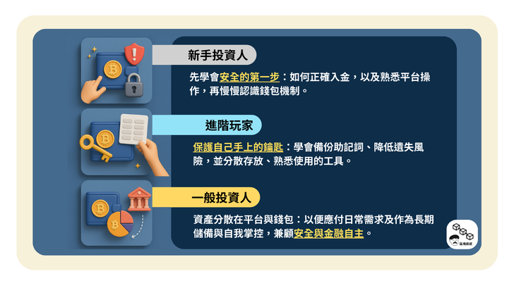 - 資產分散在平台與錢包最務實。