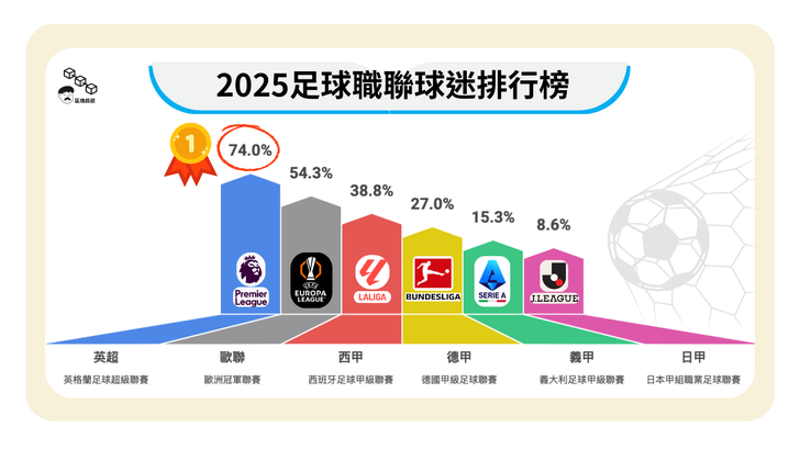 世界盃後,各國球員回歸職業隊,英超、西甲、德甲、義甲和法甲,歐洲五大聯賽匯集了大部分球星。而該報導做了份問卷調查,一共回收約1000份有效問卷,問卷結果顯示有高達74%英超球迷,已佔了全台球迷超過7成的比例。