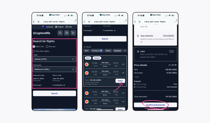 - 輸入行程資料(出發地、目的地、日期等),篩選可用加密支付的航班選項