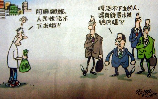 也許....只是也許,當有天一個拎袋木炭想回家自殺的百姓經過,陳水扁先生還會解讀成:「經濟哪有不好?你看,走在路上的行人還有錢買炭烤肉。」