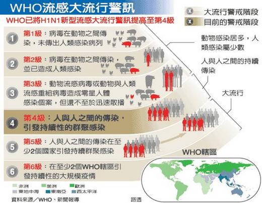 世界衛生組織(WHO)廿七日將HINI新型流感警戒升級,從第三級升至第四級,即出現病毒在人與人之間持續傳播,顯示爆發大規模疫情的危險性升高。世衛還表示,機場港口加強檢疫難以防範新型流感入侵。 這是世衛組織史上首度將流感警戒提升到第四級。 世衛表示,由於病毒傳播廣泛,遏制病毒傳播已不可行,因此目前集中措施於「減緩傳播」。 雖然各國都在海關加強檢疫,但世衛說,機場與港口的防疫篩檢無法準確驗出H1N1新型流感病毒。世衛發言人哈托表示:「如果某個人曾接觸病毒或已受到感染,他在機場可能不會出現症狀。入境篩檢無效。」 世衛警報系統分六級,目前新流感病毒符合人際傳染的第四級標準,但還未達在社區「廣泛」傳染程度。世衛提升警戒等級,顯示新型流感可能發生大規模疫情,但目前尚未達此程度,也並非無法避免。 世衛目前不建議關閉邊境或限制國際旅行,但要求患者推遲國際旅行,在旅行後出現症狀者應立即就醫。 同時,世衛與聯合國糧農組織廿七日指出,食用經適當處理、加工的豬肉或其他豬產品,不致感染新流感,攝氏七十度烹調溫度通常可殺死新流感病毒。